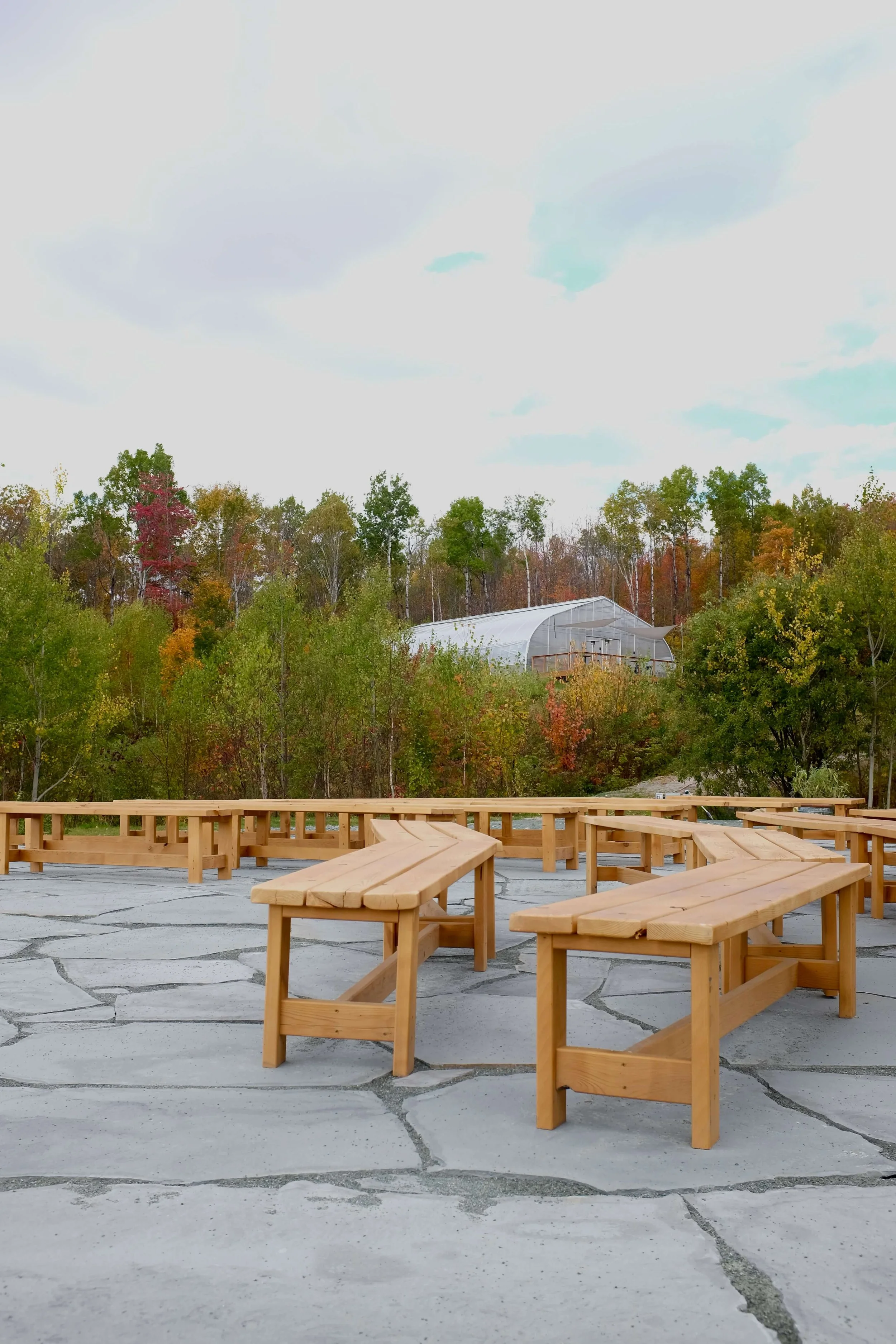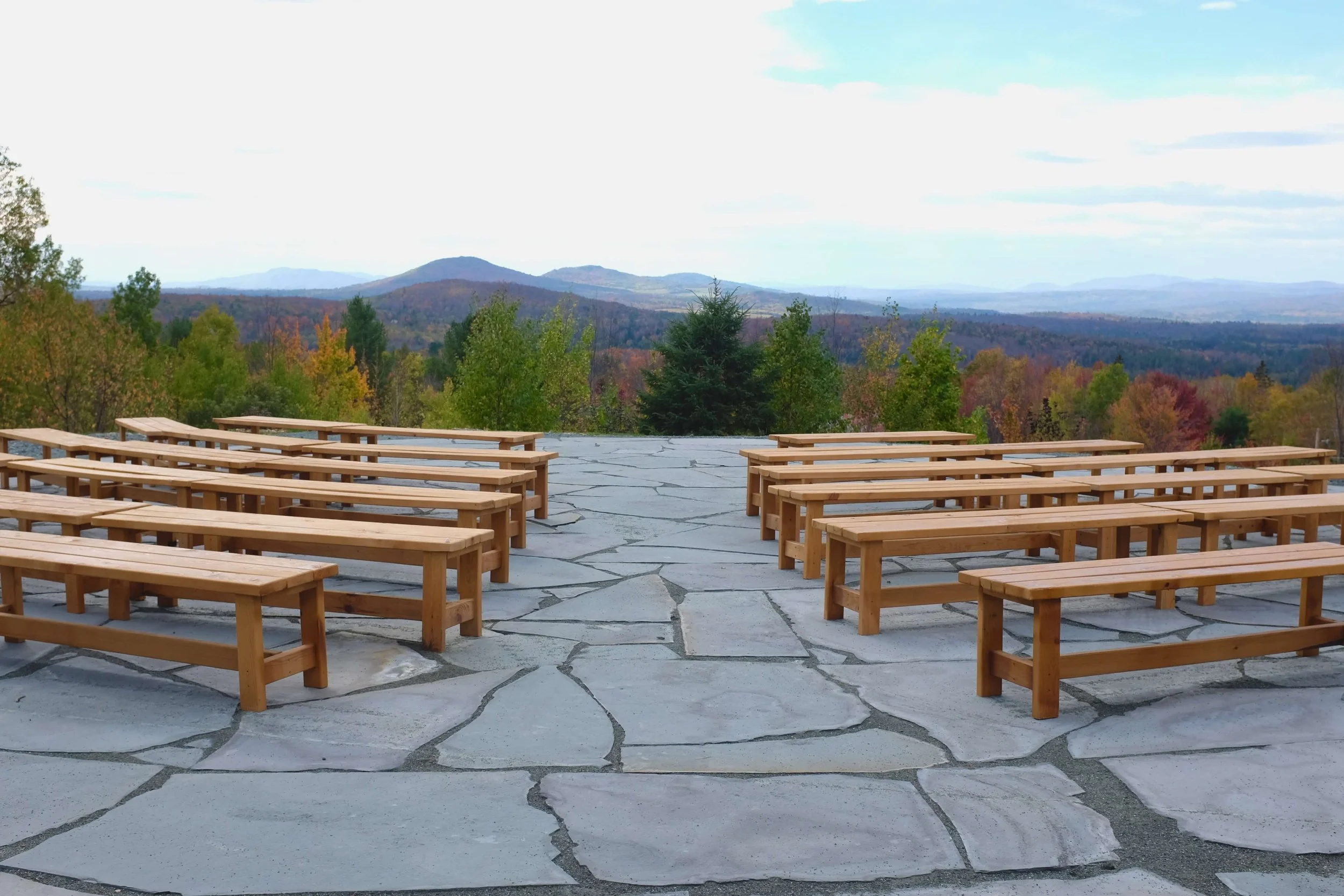 Our stone patio is framed by perennial plantings and elevated off the hillside for an infinity-pool effect overlooking the green and white mountains. This flexible space can host ceremonies and gatherings of all shapes and sizes. A bit more about the space: